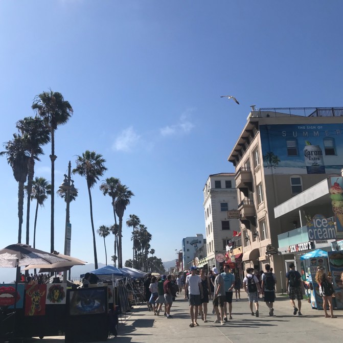 Venice Beach has a totally different vibe than Santa Monica. Venice is almost frenetic with its sidewalk bars, artists stands, skateboarders, and surfers hauling their boards down the boardwalk palm tree-lined boardwalk. I was in love.